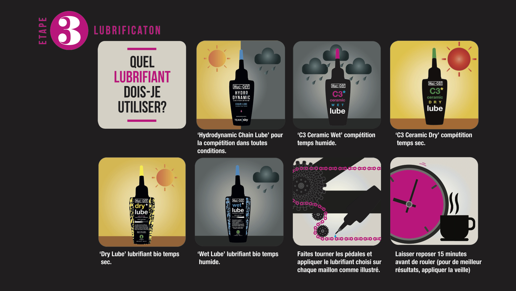 étape 3 du nettoyage entretien de votre vélo en hiver avec Muc Off la lubrification de la transmission VTT route du team Sky sel routes sale